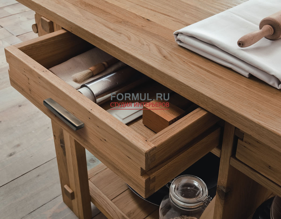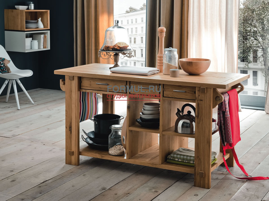 Кухонный остров с полками и выдвижными ящиками LB-ZC7250. Структура — массив дуба в натуральном или цветном лаке. Ручная отделка поверхности столешницы и ножек элементами старения, шлифовки, рельефного рисунка.