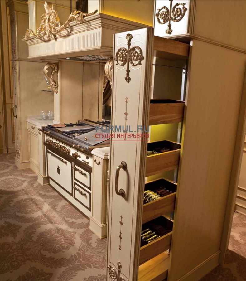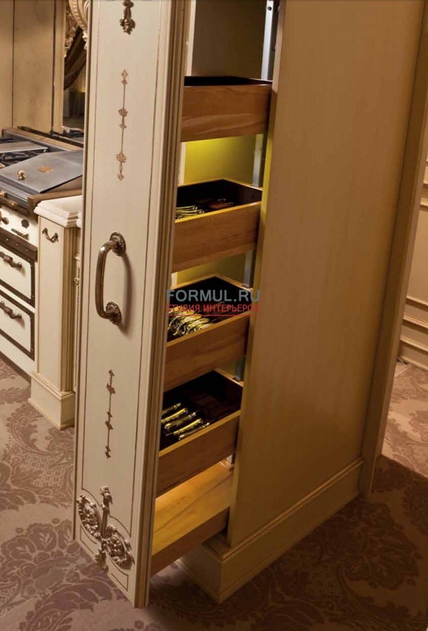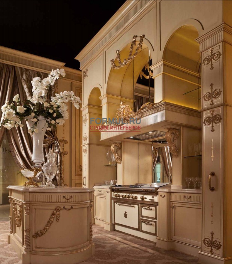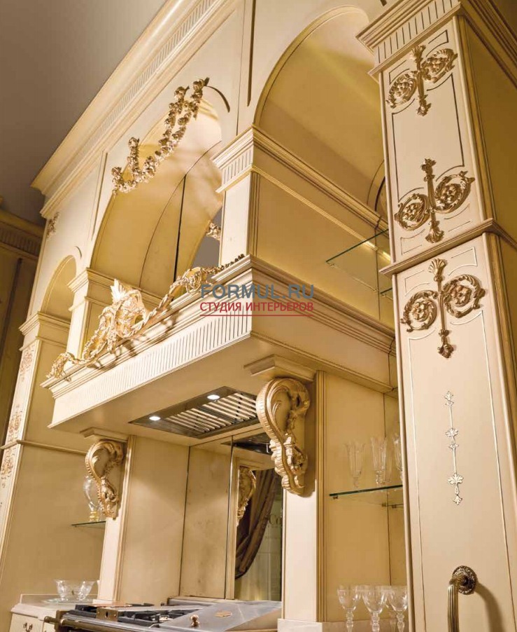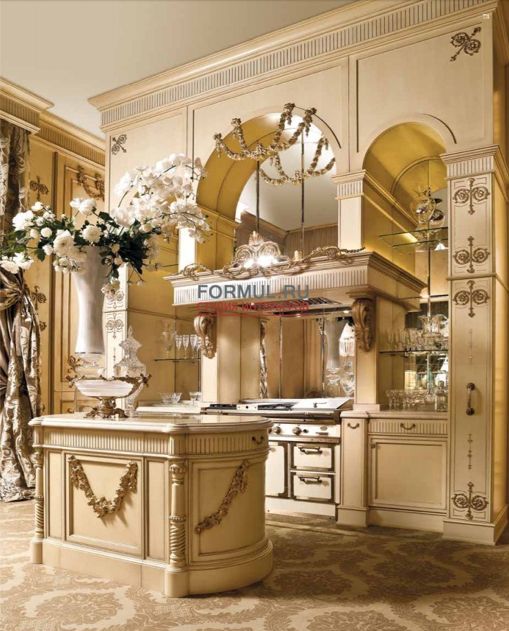 Гармоничная атмосфера для эксклюзивной кухни. Коллекция, где технологические инновации и вечная красота собрались вместе, определяя уникальный и исключительный дизайн интерьера. Великолепный и впечатляющий образ, который является результатом творческого дизайна архитекторов и мастеров. Обстановка полна всех технических и функциональных объектов, которые элегантно скрыты стилистическими решениями. Центральный остров с декоративными рамками, резными фризами. Мраморный верх.