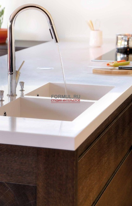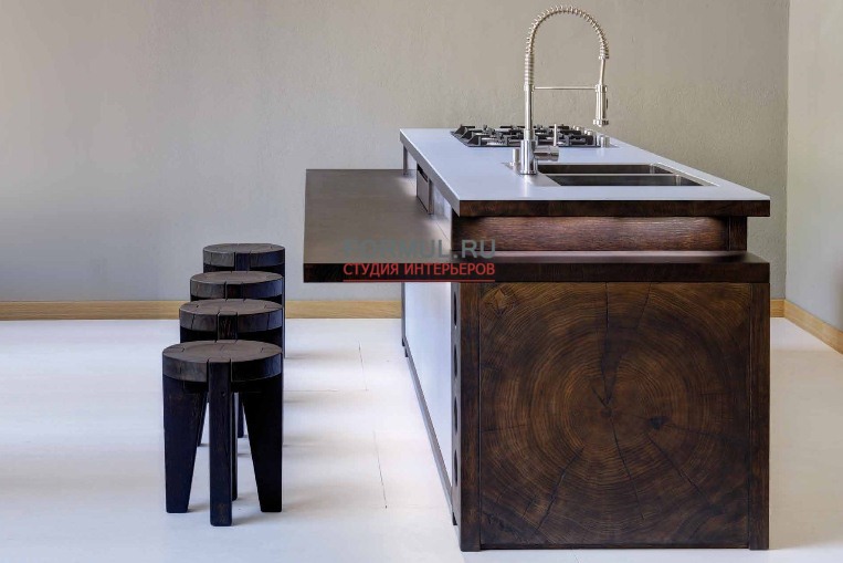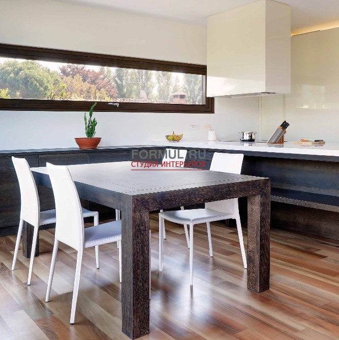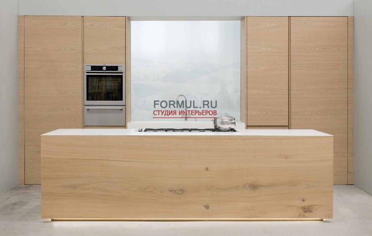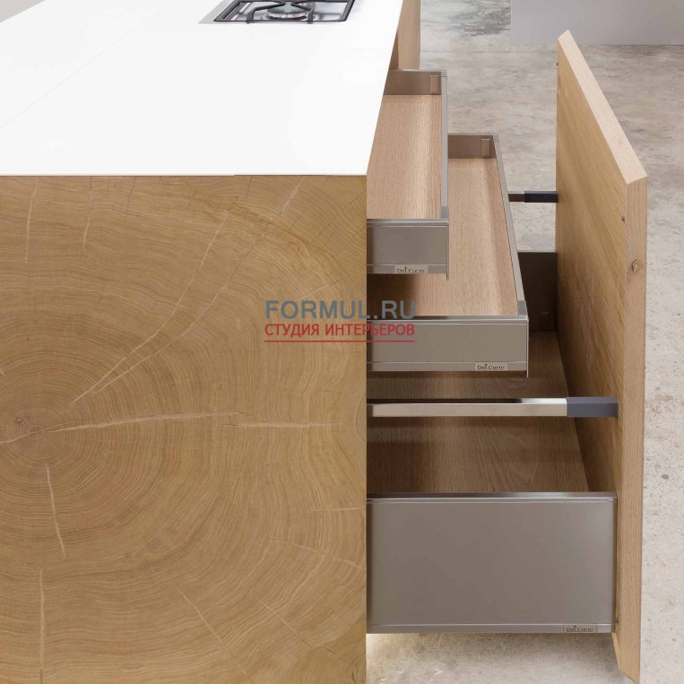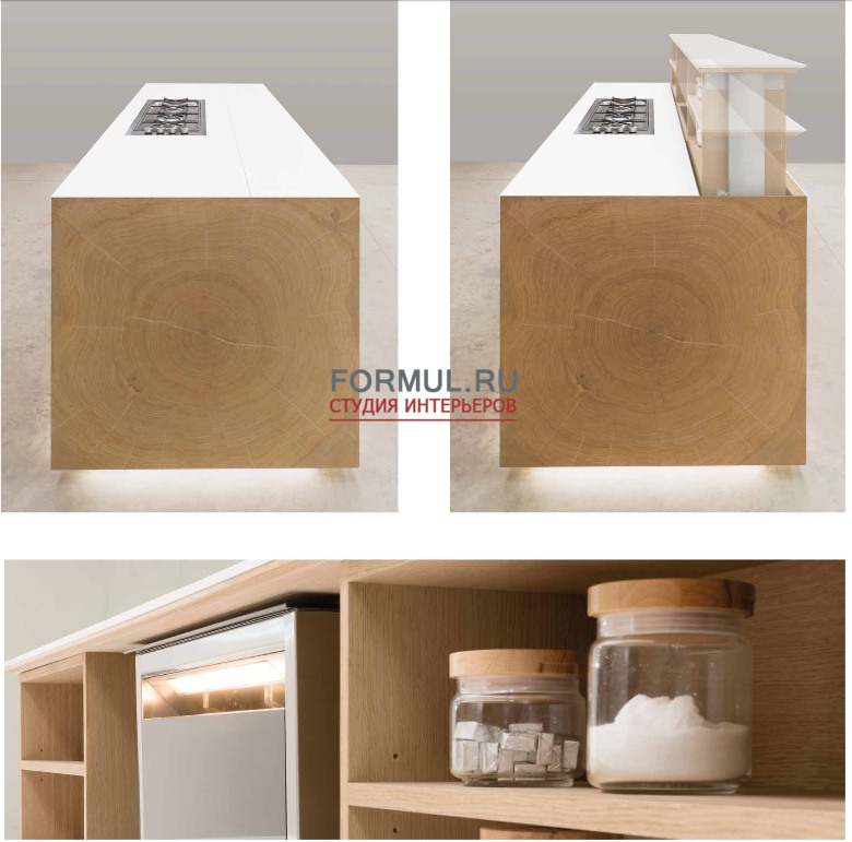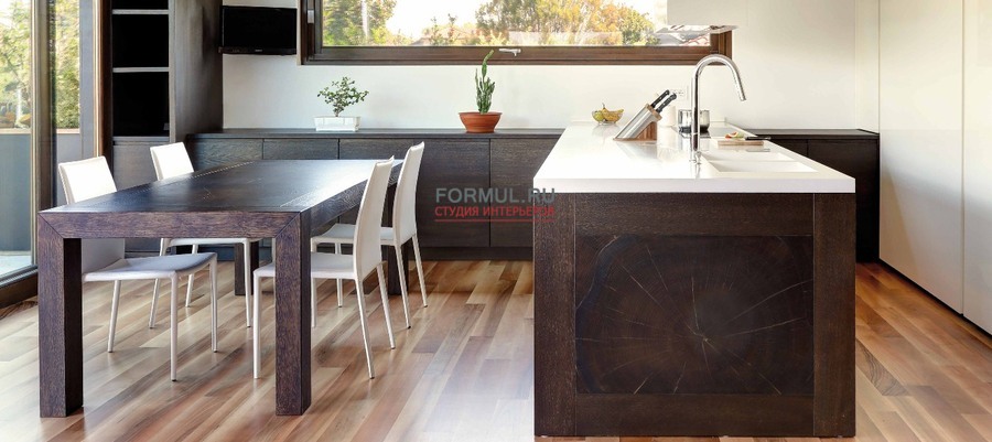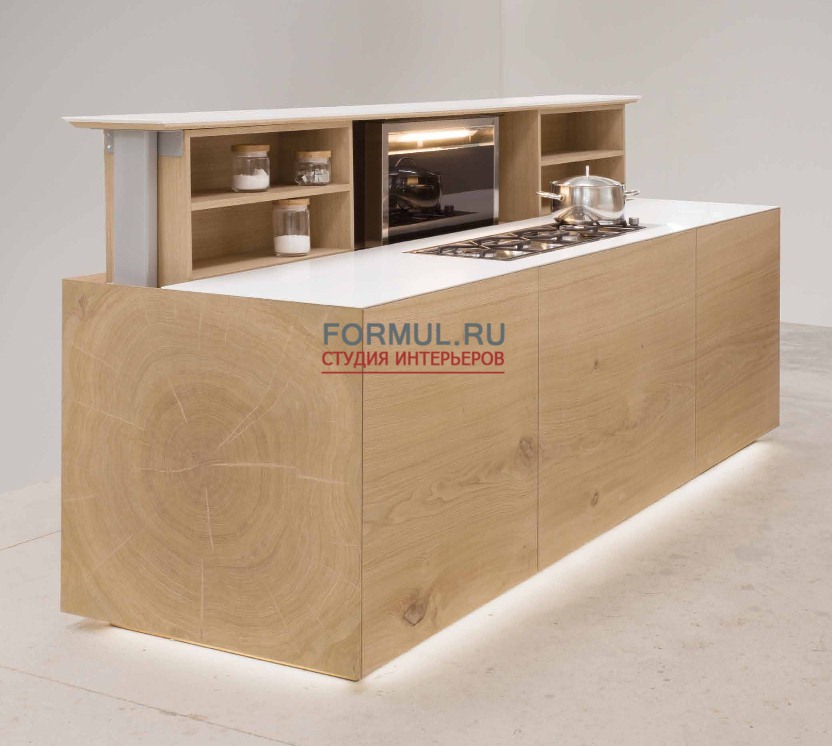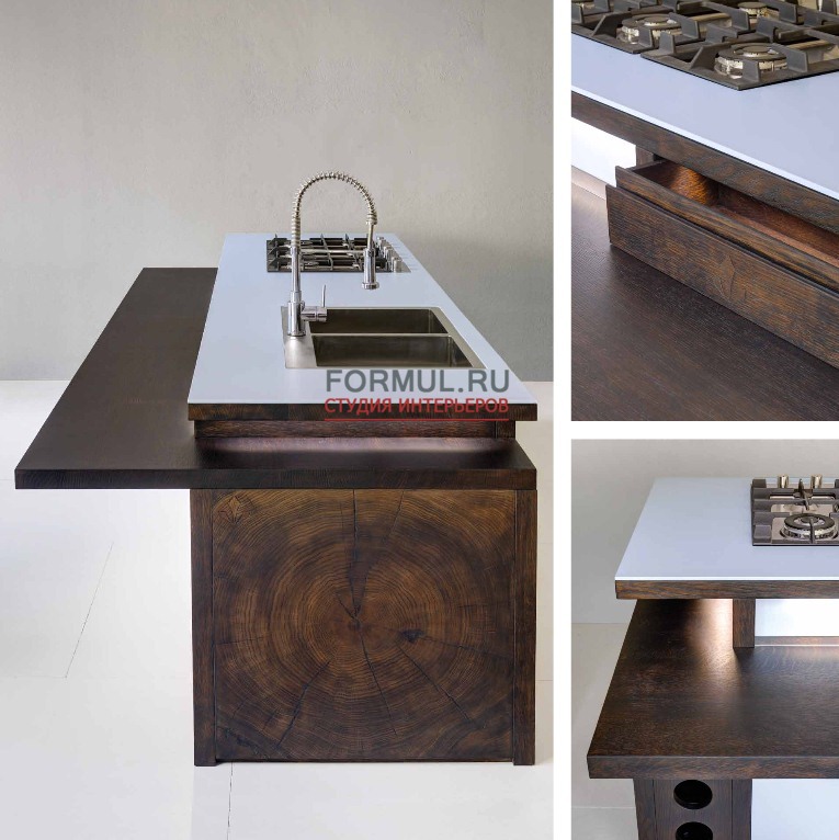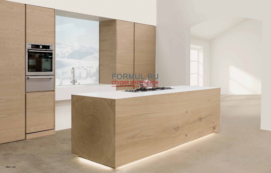 Движение геометрических рисунков, пересекающиеся плоскости, объемные фигуры, световые контрасты, подчеркнутые визуально-тактильными особенностями дерева, делают уникальной эту кухню, созданную для удовлетворения самых требовательных клиентов.