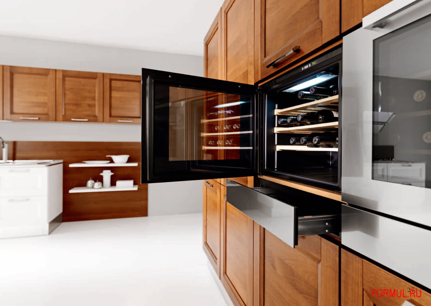 Кухня. Выполнена из массива дерева с облицовкой деревянным шпонам. Встроенная бытовая техника. Выдвижные ящики и распашные дверцы с устройством закрывания пуш ап. Модель в современном стиле. Цветовая гамма по каталогу производителя.