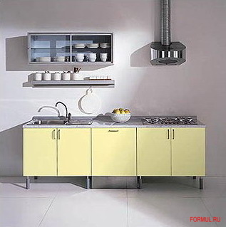 Кухня состоит из алюминиевых шкафов, фасад выкрашен в соломенно-желтый цвет. Шкафы оборудованны полками. Столешница выполнена из мрамора.
