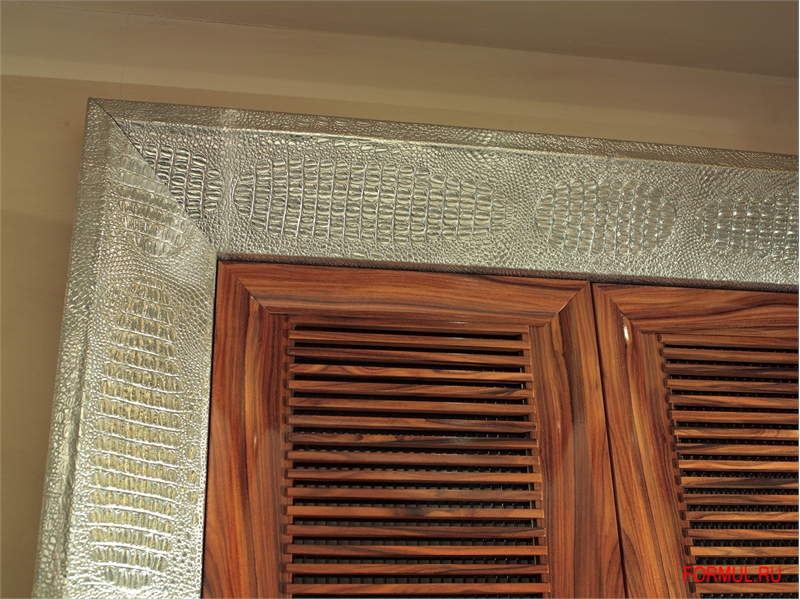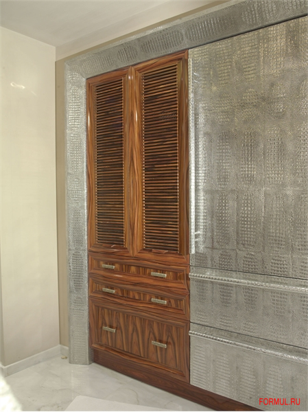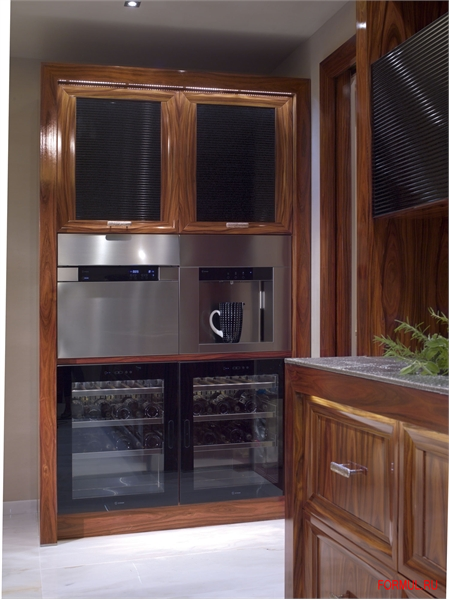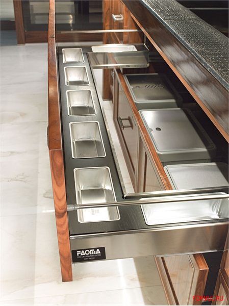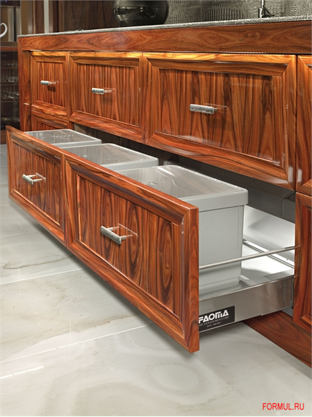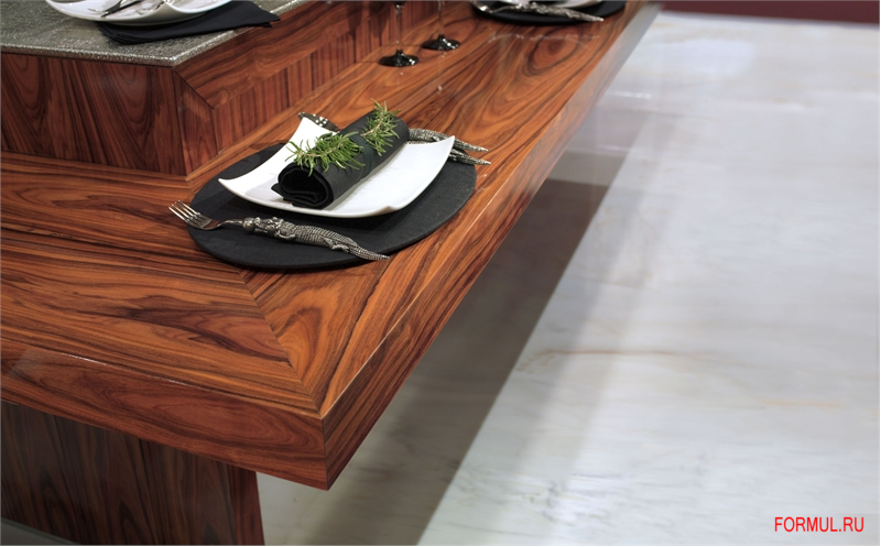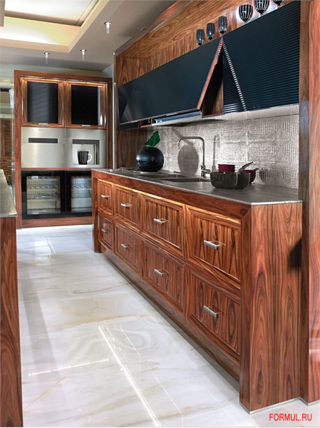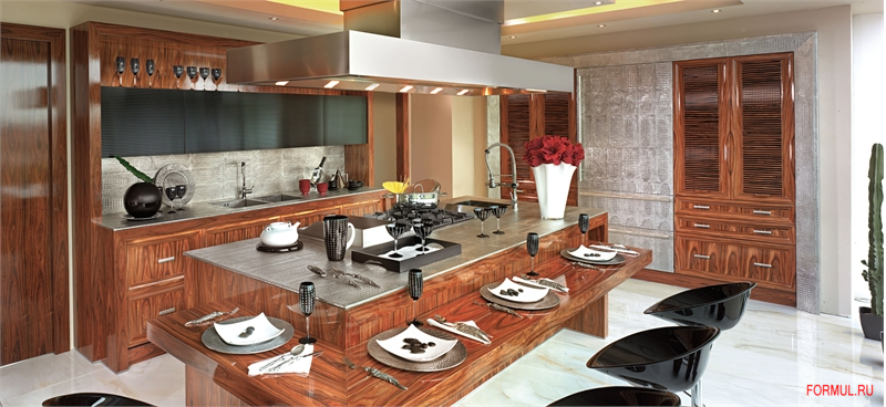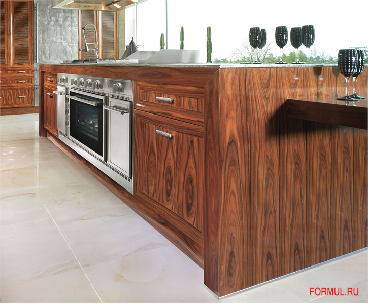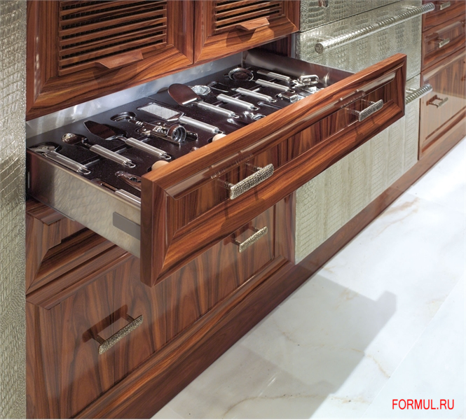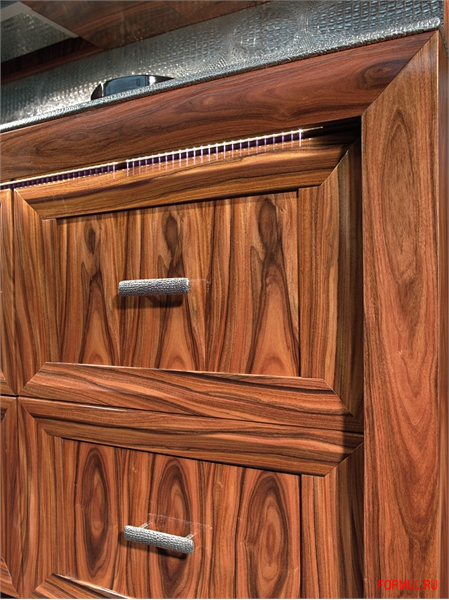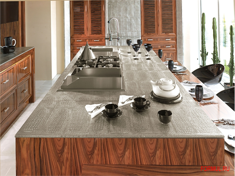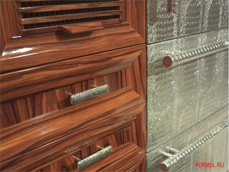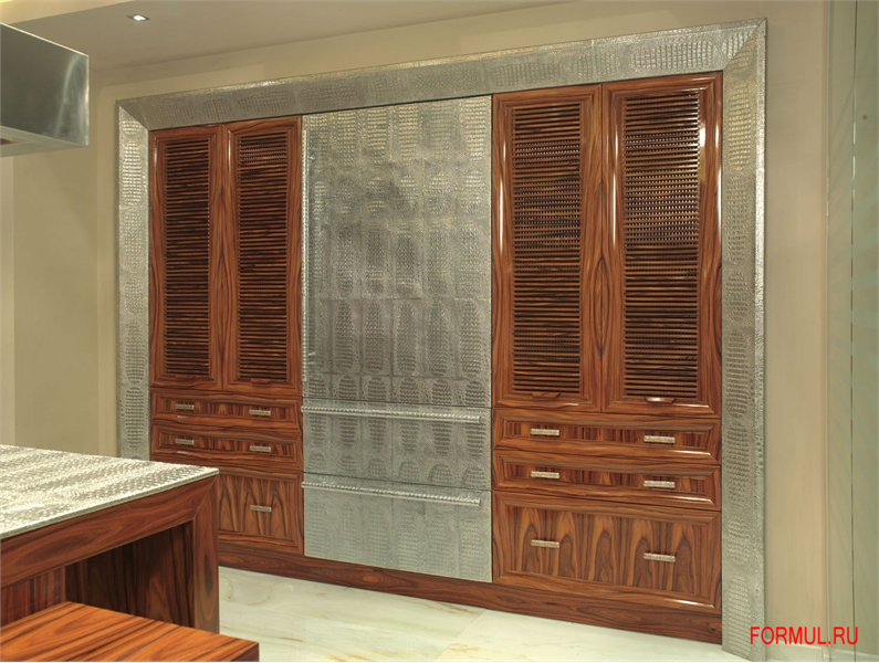 Ручки, столешницы, фасады отделаны под кожу крокодила. Также каркасы и фасады могут быть фанерованы шпонам древесины различных цветов. Есть множество выдвижных ящиков, шкафчиков а также отсек для хранения кухонной посуды. Отличный выбор для кухни в классическом стиле. Цветовая гамма: коричневый, натуральный цвет дерева.