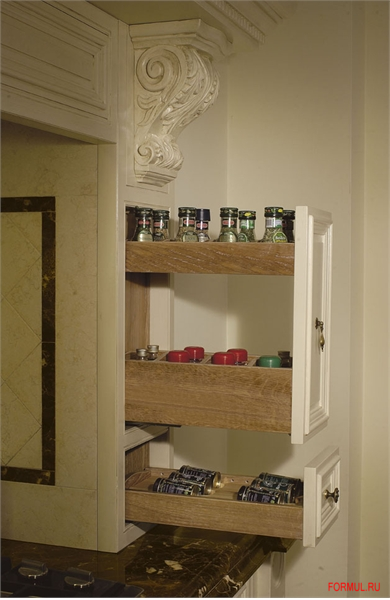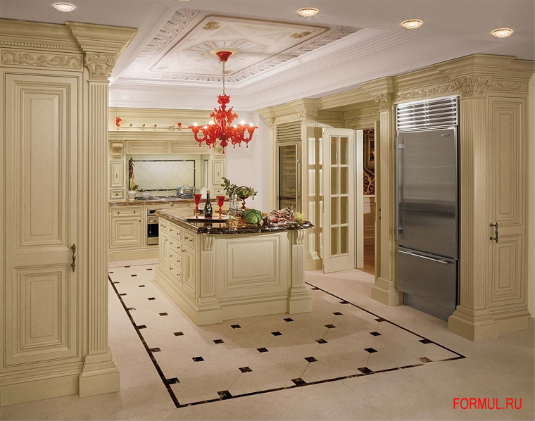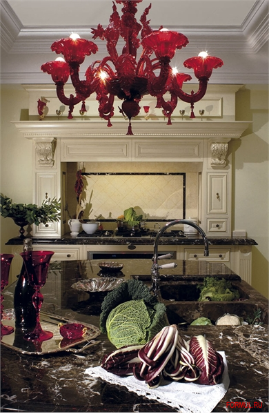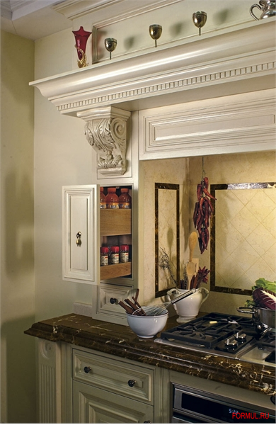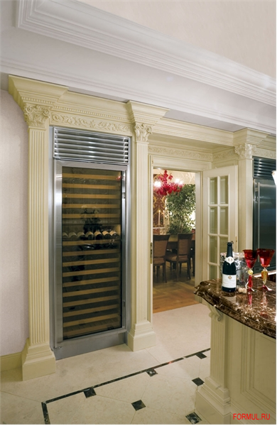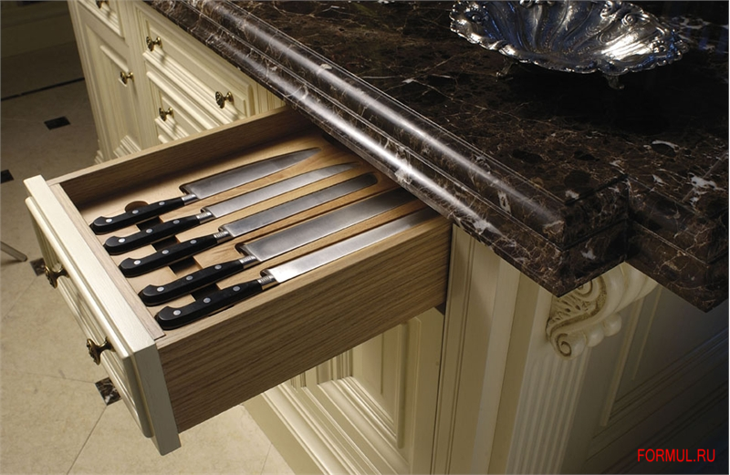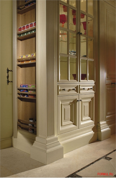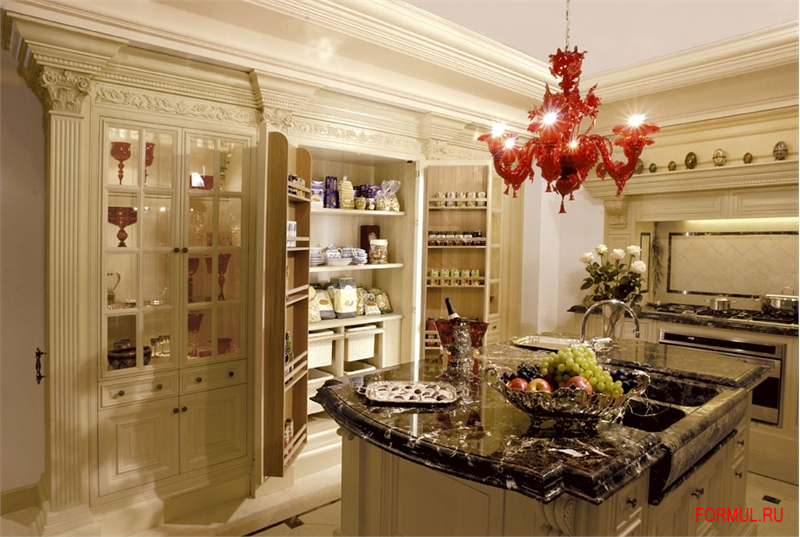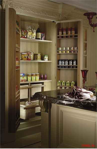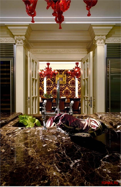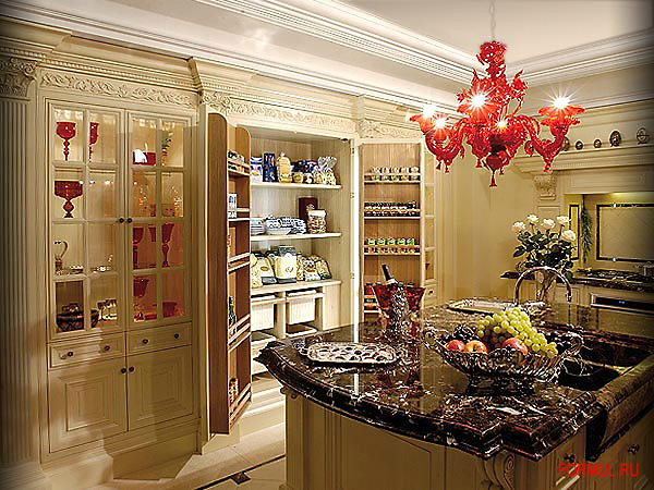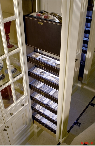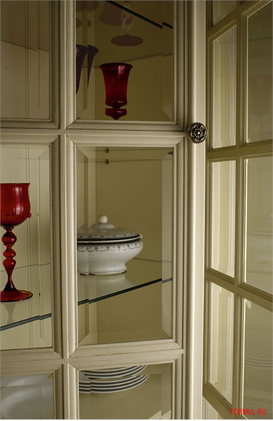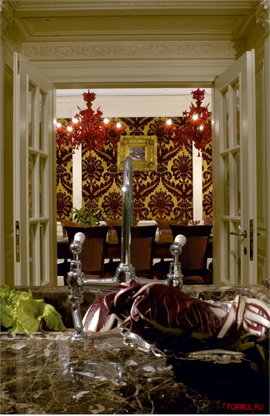 Кухонныый гарнитур с фасадами из искусственно состаренной, покрытой белым лаком древесины. Столешницы и мойка выполнены из цельного мрамора. Рамы дверок изготовлены из массива древесины, центральная часть — из шпонированной МДФ. Для создания интерьера использованы архитектурные детали — колонны с каннелюрами и пилястры, за которыми скрыты обтянутые кожей системы хранения с внутренней подсветкой (выдвигаются с помощью пульта дистанционного управления). Стеновые панели отделаны парчой. В столовую группу входят стол и стулья из массива вишни. Вся мебель изготовлена вручную. В дополнение предлагается разработанное для коллекции столовое "серебро".
