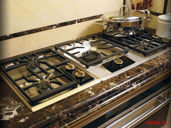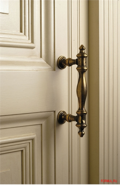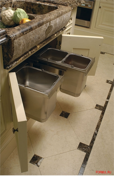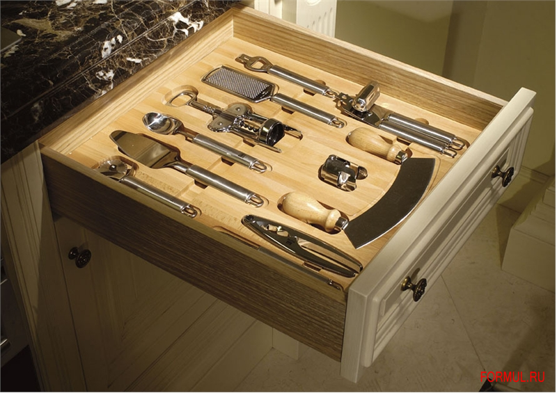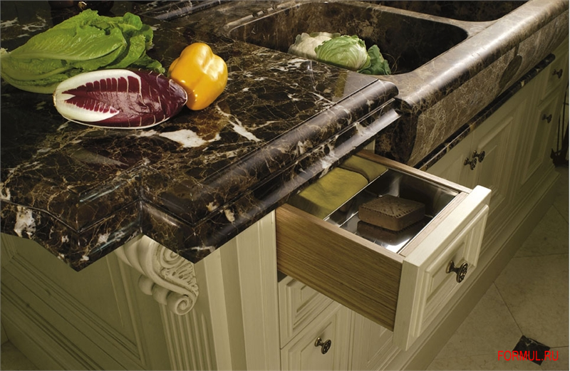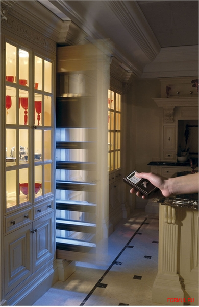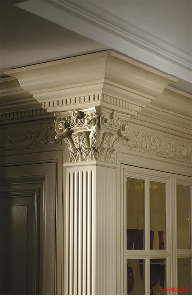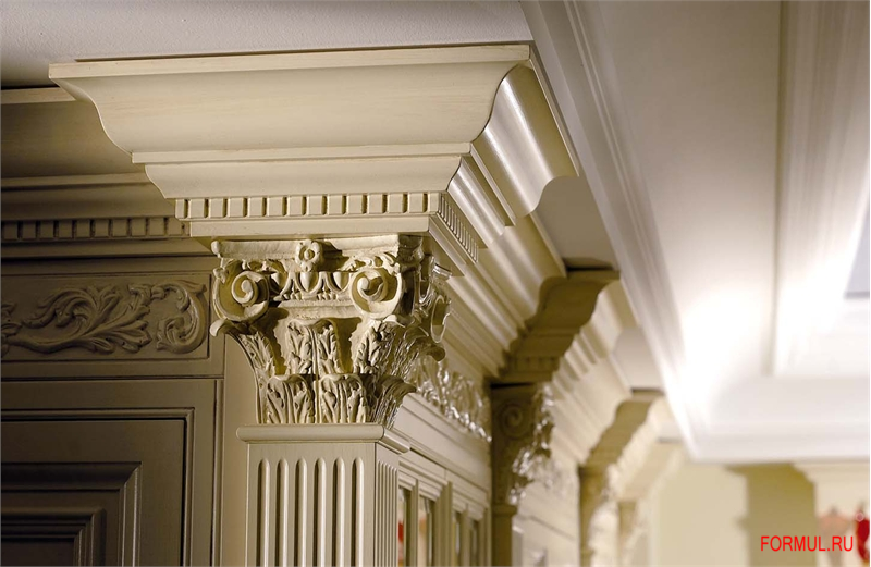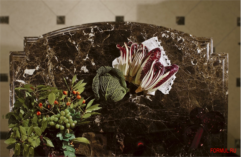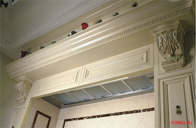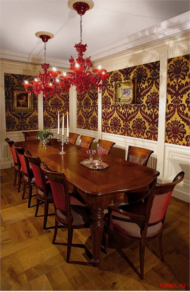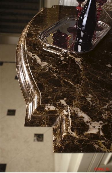 Кухонныый гарнитур с фасадами из искусственно состаренной, покрытой белым лаком древесины. Столешницы и мойка выполнены из цельного мрамора. Рамы дверок изготовлены из массива древесины, центральная часть — из шпонированной МДФ. Для создания интерьера использованы архитектурные детали — колонны с каннелюрами и пилястры, за которыми скрыты обтянутые кожей системы хранения с внутренней подсветкой (выдвигаются с помощью пульта дистанционного управления). Стеновые панели отделаны парчой. В столовую группу входят стол и стулья из массива вишни. Вся мебель изготовлена вручную. В дополнение предлагается разработанное для коллекции столовое "серебро".