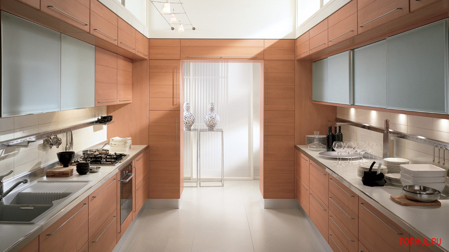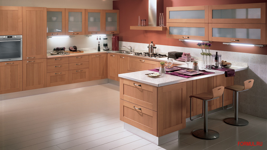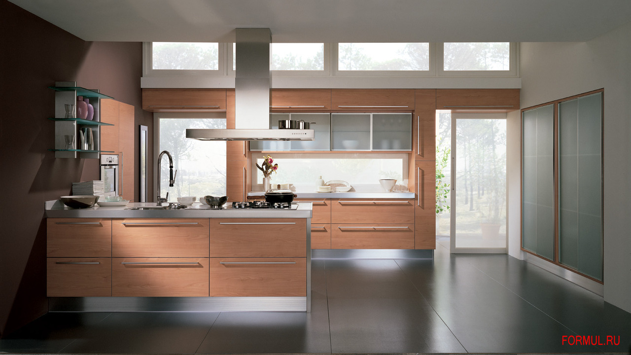 Кухня в современном стиле. Каркас - ламинированная ДСП (толщина 18 мм) класса Е1. Фасады из массива липы в шпоне вишни, покрытом матовым лаком / ДСП класса Е1 в шпоне вишни / ламинированные в отделке алюминием или пластиком по краям / в лаке различных оттенков из коллекции компании. Также доступны с закаленным стеклом в алюминиевой раме / из массива липы в шпоне вишни, покрытом матовым лаком. Внутренние полки из ламинированной ДСП (толщина 18 мм) класса Е1 / закаленного стекла толщиной 6 мм. Панели нижних ящиков с системой полного открывания выполнены из металла. Ручки из матового металла. Гарнитур дополняется декоративным карнизом из ламинированной ДСП класса Е1, тонированной под вишню. Предлагаются открытые навесные полки (ДСП) в отделке пластиком и металлические сушилки для тарелок.