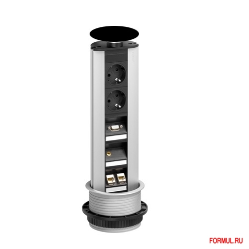 Выдвижная розетка Evoline Port Multimedia Professional 931.01.979 с крышкой из пластика, цвет чёрный. Встраиваемая розетка комплектуется двумя электрическими розетками немецкого стандарта, повернутыми под углом 60 градусов, одним разъемом VGA 15-pin, одним аудио разъемом и двумя компьютерными соединителями стандарта RJ 45. Модули VGA и аудио встраиваемой розетки повернуты под углом 45 градусов и углублены, что позволяет опускать розетку при подключенных информационных проводах. Встраиваемая розетка комплектуется электрическим проводом длиной 3 м с вилкой европейского стандарта, 3 метровым VGA проводом, оканчивающийся 15-pin VGA разъемом, 3 метровым аудио кабелем с 3,5 мм джек. Встраиваемую розетку можно установить не только на кухне, но и в кабинете, в офисе, на рабочем столе школьника или студента.