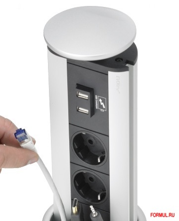 Выдвижная розетка Evoline Port USB Charger 931.03.872 с крышкой из нержавеющей стали (2 розетки+2 разъёма USB), длина 3 м. Встраиваемую розетку можно установить не только на кухне, но и в кабинете, в офисе, на рабочем столе школьника или студента. Встраиваемый модуль для подзарядки всех типов USB устройств: мобильные телефоны, mp3-плееры, IPhone, IPad, видео и др. электронные устройства. Розетку можно установить в верхние шкафы (при установке на кухне) с максимальной толщиной 50 мм. При установке самостоятельно без помощи специалистов Вам необходимо будет фрезой сделать монтажное отверстие диаметром 102 мм, глубина сверления должна быть до 45 мм. Для того чтобы воспользоваться встроенной выдвижной розеткой необходимо нажать на углубление на крышке и потянуть ее, тем самым Вы вытянете розетку, подключить вилку оборудования которое Вы собираетесь использовать и задвинуть розетку обратно в столешницу. Между крышкой и панелью остается пространство для свободного прохода кабеля.