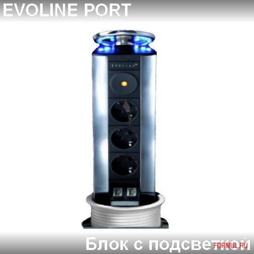 На ваш выбор имеется несколько готовых вариантов функционального наполнения розеток Evoline Port : простые - с электрическими розетками (на две и на три розетки) ; комбинированные (электрические розетки с разъёмами для подключения телефона и компьютера) . Помимо этого длина кабеля может составлять 2,5 или 3,0 м ; крышка может быть выполнена из пластика или нержавеющей стали и окрашена в чёрный , серебристый или бронзовый цвет ; модульный блок может быть с подсветкой из 6 -ти голубых светодиодов .