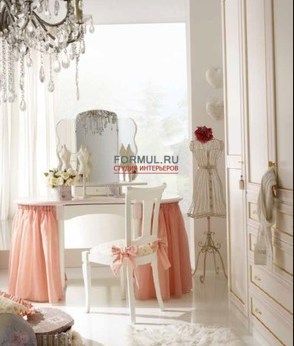 Туалетный столик с выдвижным ящиком, по бокам расположены полочки, закрытые пышными шторками;