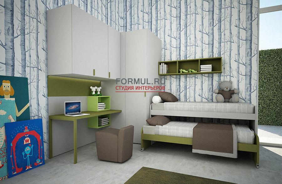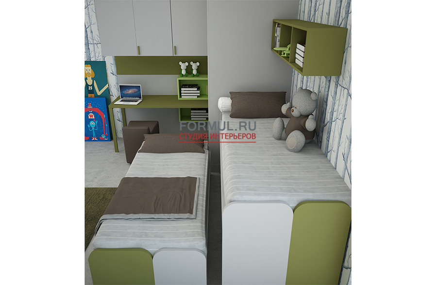 Кровати, экономящие пространство Spider (одна под другой), навесной шкаф–мост, письменный стол, шкаф, навесные полки-библиотеку. Сочетание холодных цветов Светло-серого, Оливкового и Зеленого Яблока придают комнате таинственность и неординарность.