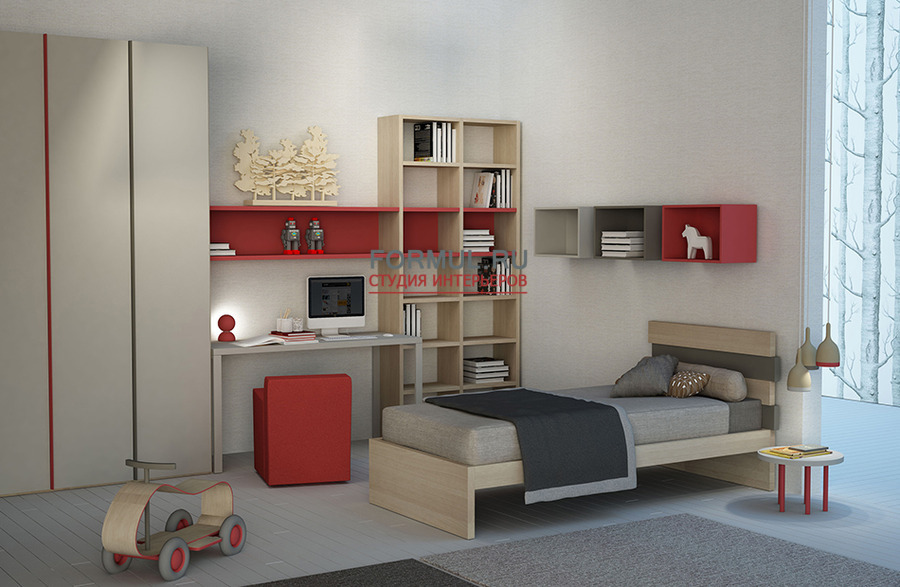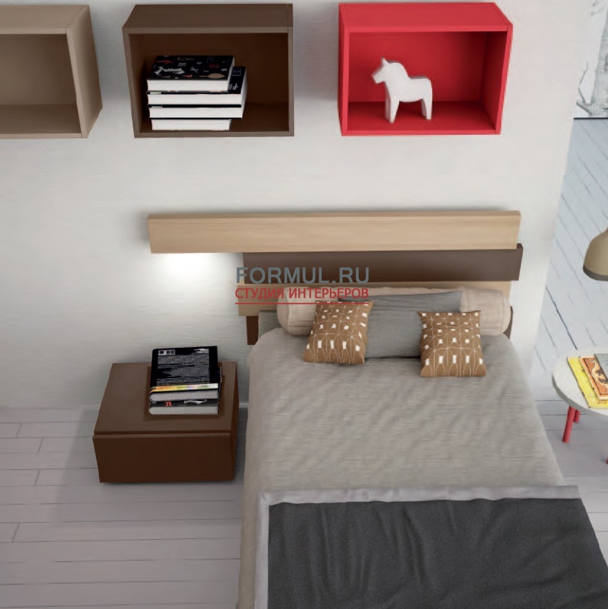 Кровать серии Stripes (полоски), шкаф с навесными дверьми, настенные полки для хранения, прикроватный столик cерии Linea, письменный стол. Изголовье кровати может быть дополнено светодиодами LED.