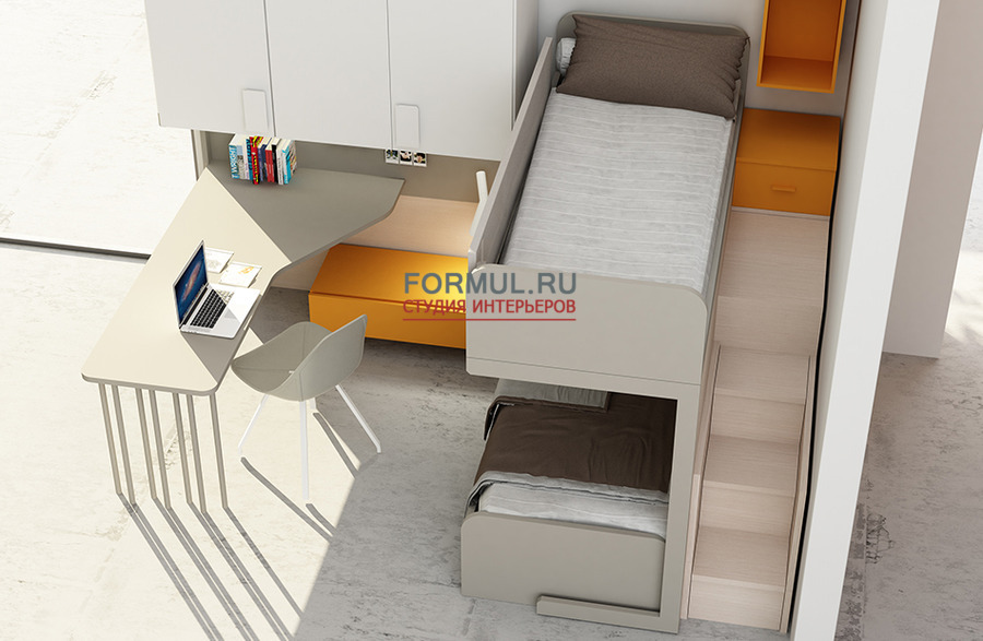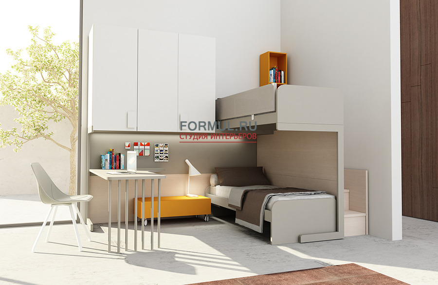 Двухъярусную кровать, лестницу-контейнер для хранения, шкаф-мост, письменный стол с основанием Palafitta, навесные полки-библиотеки, прикроватный столик серии