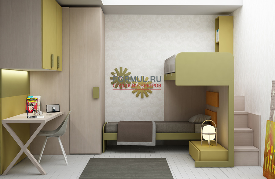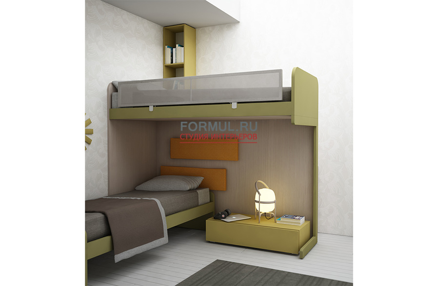 Двухъярусную кровать с металлическим бортиком, лестницу-контейнер для хранения, шкаф, навесной шкаф, письменный стол «крест-накрест», прикроватный столик серии Linea, навесные полки-библиотеки. Натуральность придает сочетание фактуры натурального Дуба и цвета — Оливкового и желтой Охры.