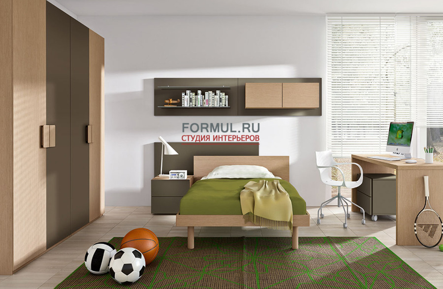 Кровать Shiny, шкаф с навесными дверьми, навесную библиотеку с полками из стекла, письменный стол с тумбочкой для хранения и прикроватный столик серии Linea. Приятные и спокойные оттенки Бежевого и Серо-коричневого Дуба создают легкую и воздушную обстановку. Материалы: Дуб и цветные лакированные покрытия.