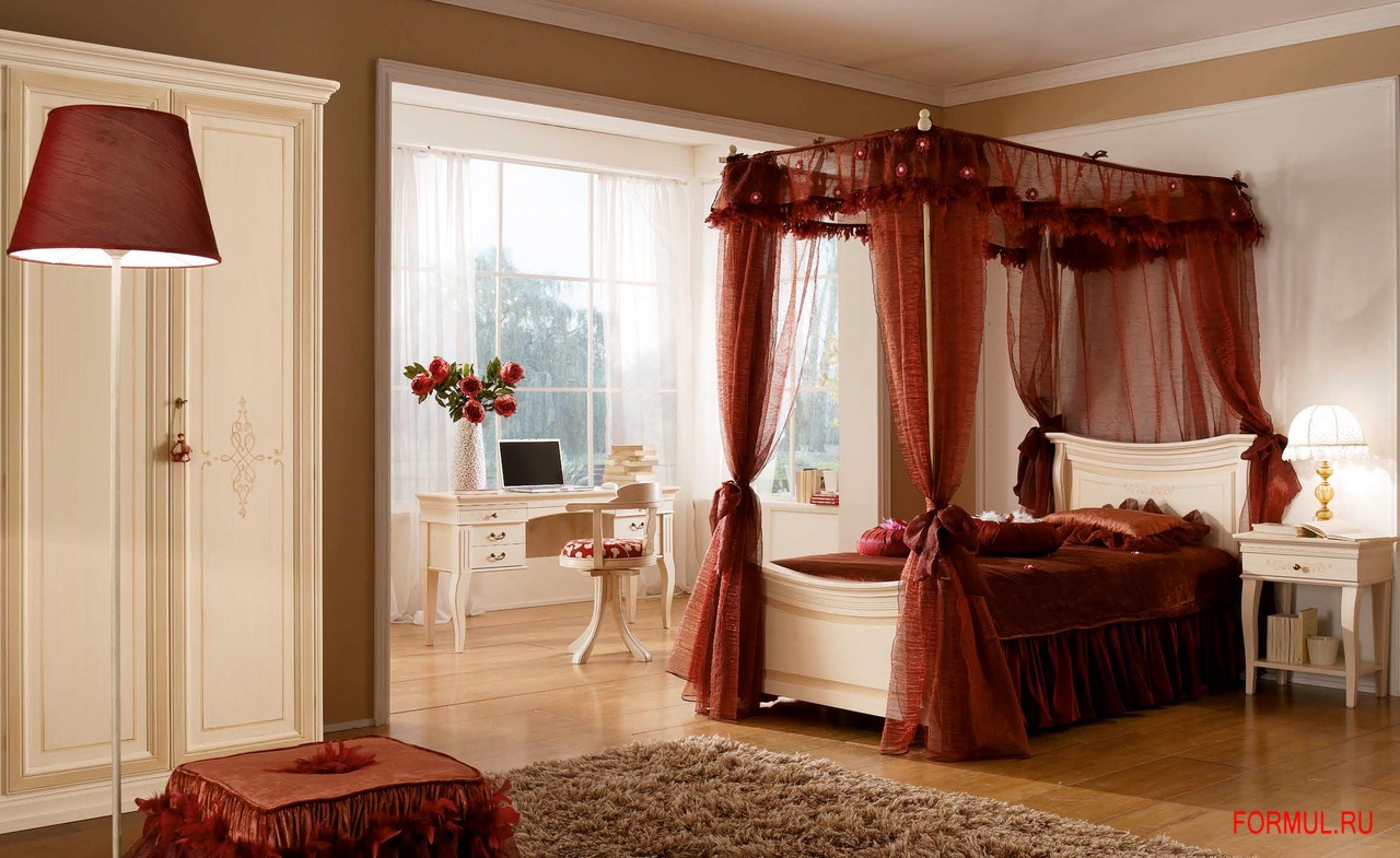 Совершенно романтичную обстановку создает кровать с белой лакировкой, выглядывающая из мягко спускающихся полотен балдахина.