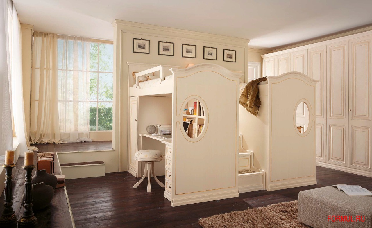 Инновационное, оригинальное решение с подвесными кроватями и центральной лестницей создает эргономичные места, где можно делать уроки. В нишах, расположенных под кроватями, размещаются тумбы с ящиками, письменные столы и гардероб.