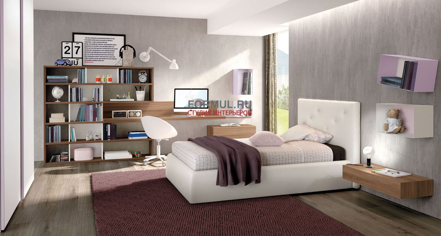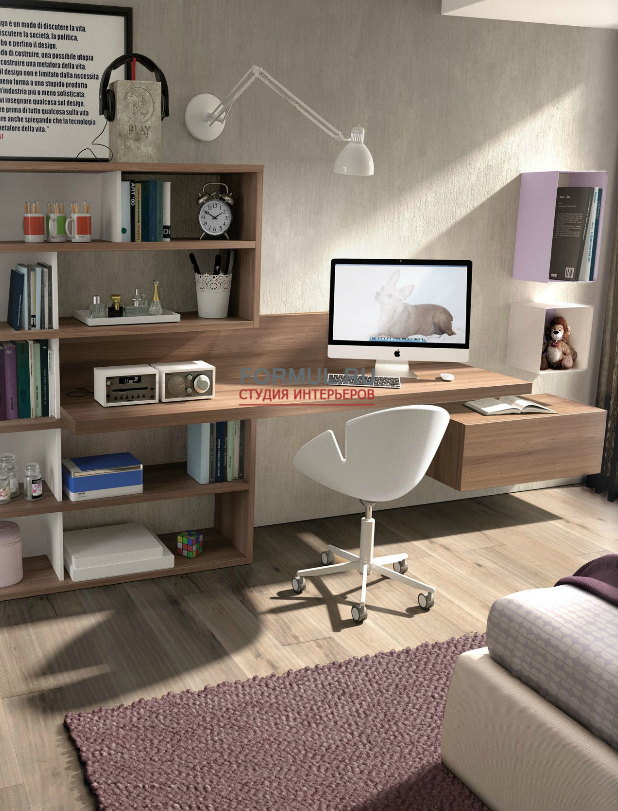 Современная юношеская комната с отделкой из высококачественного меламина с обработкой под окрашенный дуб.