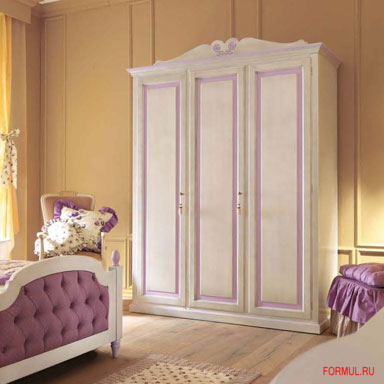 Трехстворчатый платяной шкаф для детской. Дверца запираются; ключи оформлены декоративными текстильными кистями. Модель выполнена из окрашенного массива. Классический дизайн подчеркивает резной фигурный фронтон.