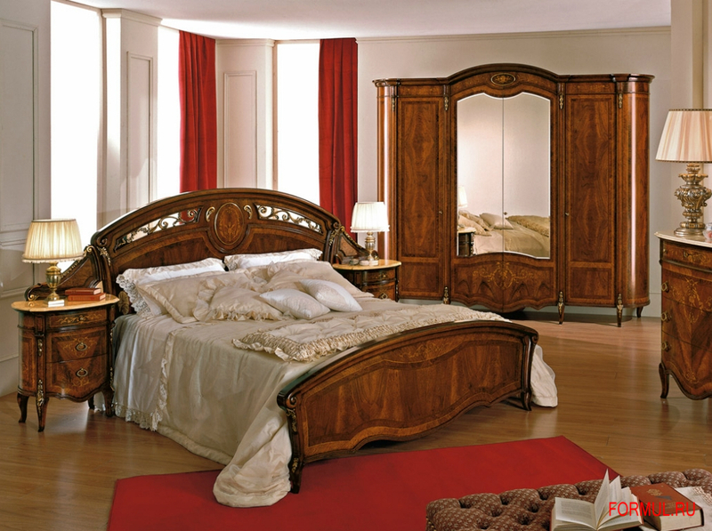 Мебель для спальни отражает выбор элегантности, характеризующий всю коллекцию. Теплые тона ореха, рисунки корня, ценная разноцветная инкрустация создают уют в спальне, где главное место занимает высококлассная кровать с тонко обработанным, сквозным, ажурным изголовьем.