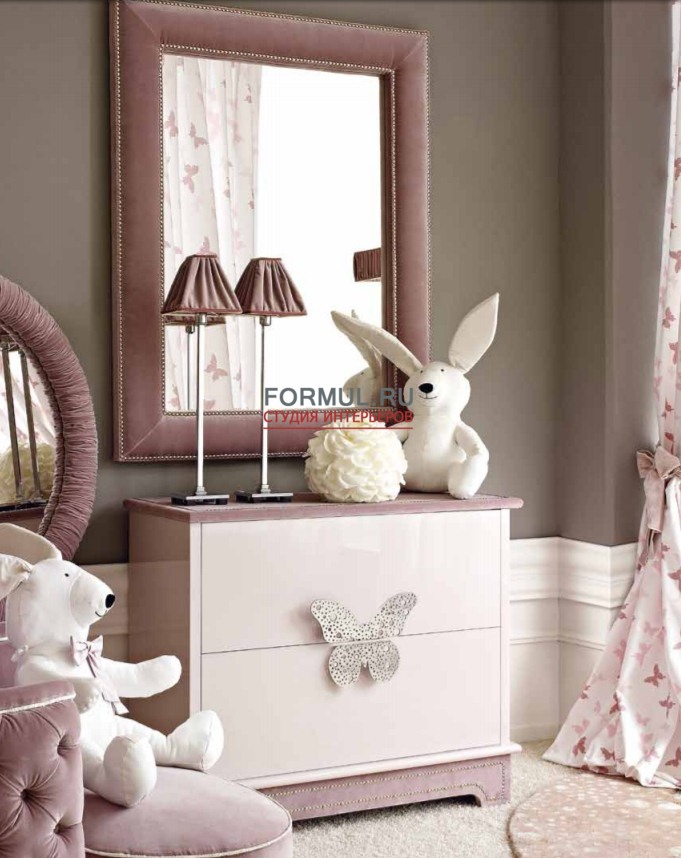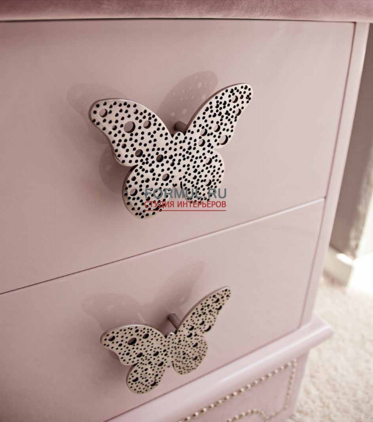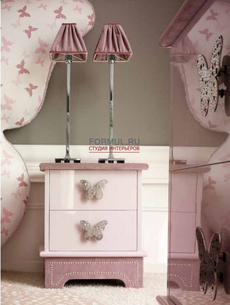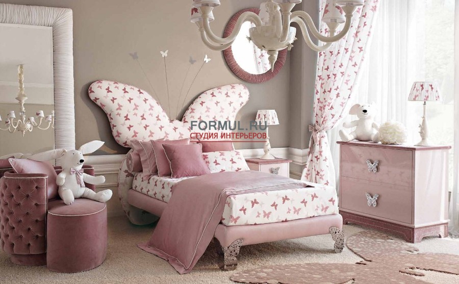 Нежная стильная, с продуманными до мелочей деталями, детская Butterfly создаст атмосферу спокойной уверенности, воздушности, тепла и уюта в комнате Вашей малышки. Изображения и форма бабочки использована в различных элементах детской. Спальня включает в себя: кровать Butterfly, прикроватная тумба MR17, комод MR18, кресло 7205, зеркало 4029, 4033I, лампа с бабочками BS25, лампа 2033, люстра BS28, коврик ILO8.