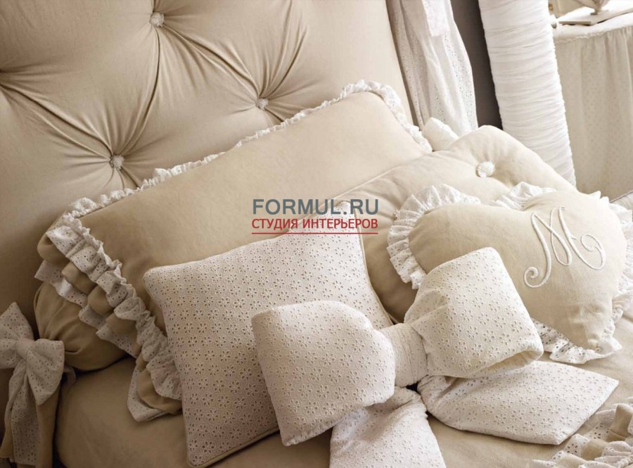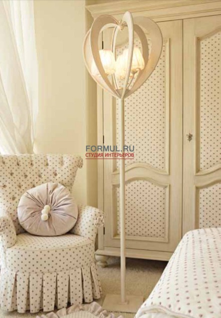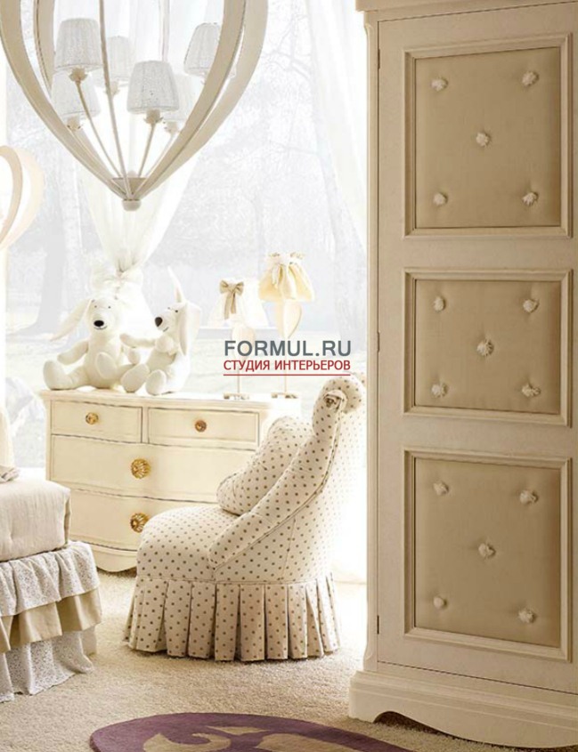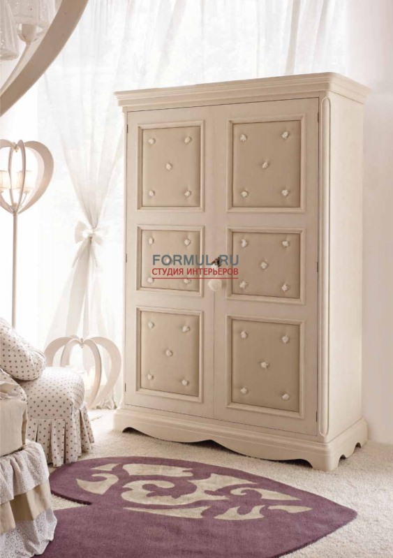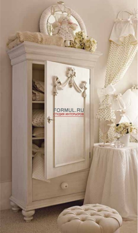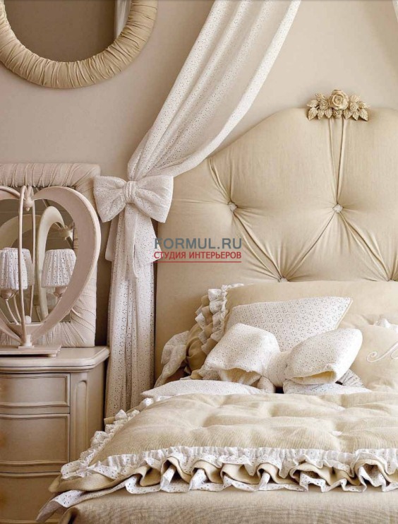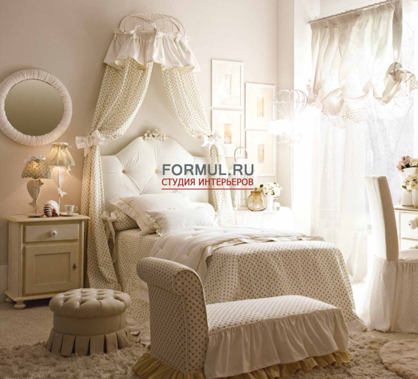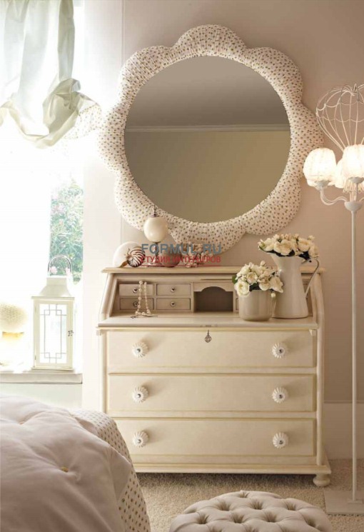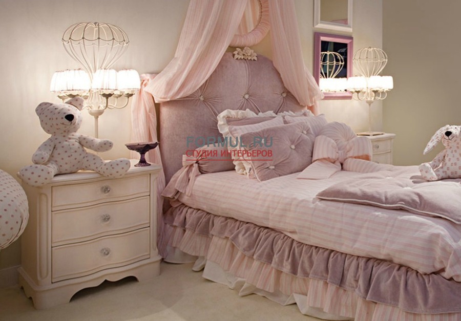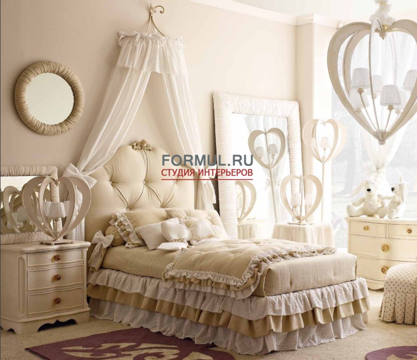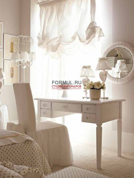 Стильная изящная мебель для молодой девушки в классическом стиле. Спальня включает в себя: кровать Vicky, комод 0335, прикроватная тумба 0337, зеркало 4010, 4029, лампа 2133, 2143, кресло 6801, шкаф 3081, письменный стол 0314.