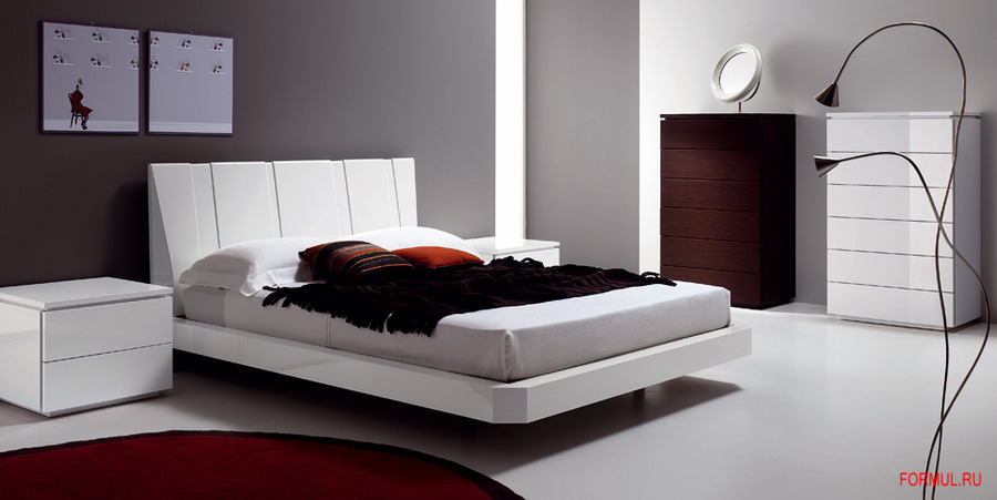 Оригинальный набор для спальни из коллекции CONCERTO от известного итальянского производителя Mercantini. В наборе представлена кровать с высоким изголовьем полностью покрытая глянцевым белым лаком. Прикроватные тумбочки и один комод отделаны в тон кровати. Второй комод выполнен из облицованного дуба кофейного цвета.