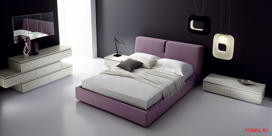 Ультрасовременный набор для спальни от Mercantini. В композиции представлена кровать в ткани нежно-сиреневого оттенка из каталога фабрики. Оригинального дизайна комод состоит из модулей. Комод и прикроватные тумбы отделаны светло-серым лаком. Дополняет композицию прямоугольное зеркало.