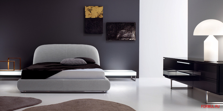 В этом наборе представлена обитая тканью кровать на хромированном основании. Прикроватные тумбочки выполнены из стекла со встроенным внутренним освещением. Черный глянцевый комод на высоких хромированных ножках покрыт лаком. Фасады выдвижных ящиков дополнены горизонтальными металлическими ручками.