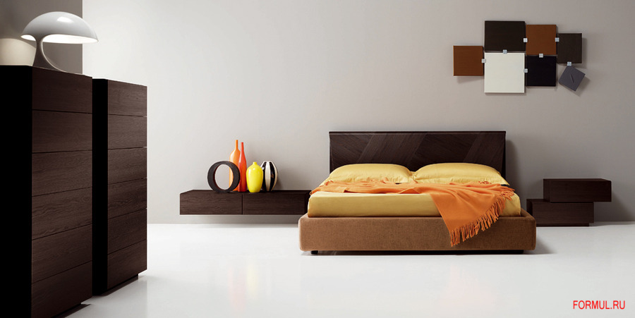 В этот гарнитур для спальных комнат входит: двуспальная кровать, прикроватные тумбочки и два комода. Изголовье кровати выполнено в темном дубе с оригинальной текстурой, каркас обит тканью. Модель оборудована удобным подкроватным ящиком. Тумбы в виде отдельных секций расположены ораториальным способом - с одной стороны на полу, с другой подвешены к стене. Высокие комоды изготовлены из древесины в тон изголовья кровати.
