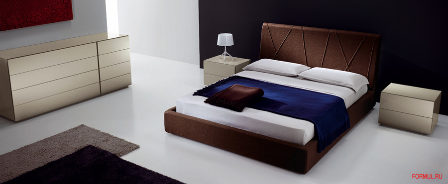 Композиция для спальни из коллекции CORA в современном стиле. Кровать с вместительным подкроватным ящиком отделана тканью шоколадного цвета из каталога производителя. Прикроватные тумбы и комод с двумя рядами выдвижных ящиков покрыты глянцевым лаком оригинального цвета. Благодаря внешнему углублению на фасаде открывать ящики будет легко и удобно.