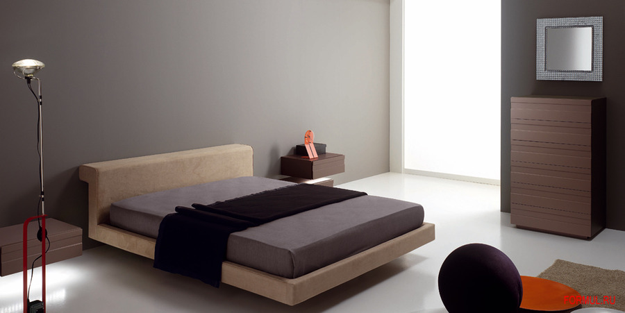 Этот набор из коллекции DALIA включает двуспальную кровать, высокий комод, прикроватные тумбы и зеркало. Кровать с изогнутым изголовьем, которое образует полку, обита материей. Прикроватные тумбы с встроенным освещением покрыты лаком шоколадного цвета. Высокий комод с шестью отделениями отделан в тон тумбочек. Дополнена композиция зеркалом в серебристой раме.
