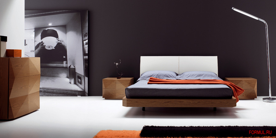 В этот набор для спальных комнат из коллекции DIAMANTE входит: двуспальная кровать, комод и тумбы в форме, напоминающей бриллиант. Кровать на ножках в каркасе из полированной древесины. Изголовье модели покрыто белой искусственной кожей. Комод с тремя отделениями и прикроватные тумбы в отделке под грецкий орех.