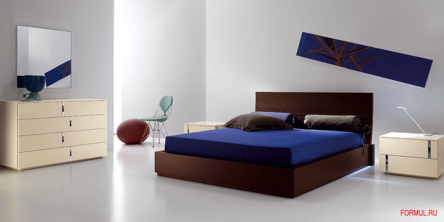 Композиция для спальни из коллекции FRIDA с кроватью BOOTЕ, выполненной из облицованного дуба кофейного цвета. Модель с высоким изголовьем и подкроватным отделением для хранения. Комод и тумбы в светлом лаке с металлическими ручками оригинального дизайна. Также в композиции представлено зеркало.