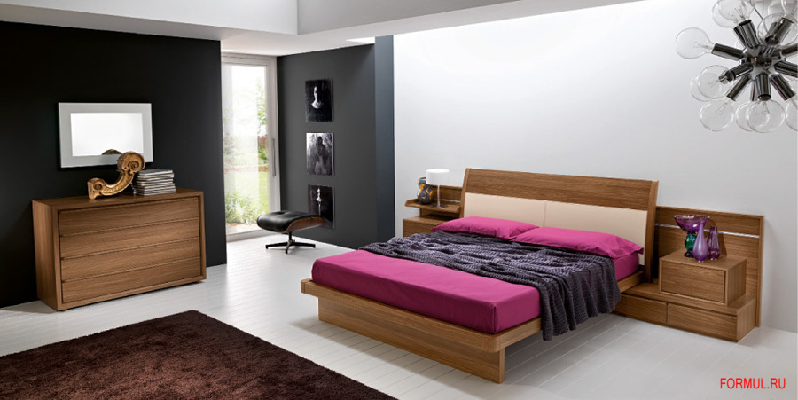 Композиция для спальни от известной итальянской фабрики Mercantini. Комплект выполнен из древесины под грецкий орех. Изголовье кровати обито тонкой искусственной кожей светлого оттенка. Комод на четыре отделения спроектирован так, что ручками служит горизонтальный профиль из древесины. Дополняет эту композицию зеркало в матовой раме.
