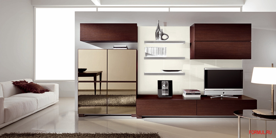 Эта элегантная композиция Mercantini сочетает в отделке различные материалы и фактуры. Нижняя тумба и подвесные ящики выполнены из древесины под дуб, горизонтальные полки для книг и мелочей покрыты глянцевым белым лаком. Створки бокового шкафа отделаны зеркалом бронзового оттенка.