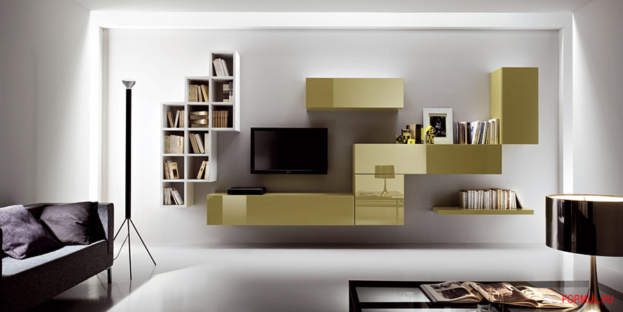 Композиция для гостиной комнаты из коллекции итальянского производителя Mercantini. Эта модель включает различные открытые и закрытые модули. Полки для книг покрыты матовым лаком белого цвета. Подвесные ящики отделаны лаком с глянцевой поверхностью яркого цвета. Покупатель может выбрать любой цвет отделки комплекта из каталога производителя.