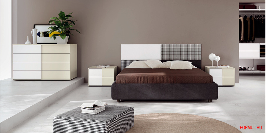 Комплект для спальни из коллекции PLAN Mercantini. Этот комплект состоит из кровати, обитой тканью. Изголовье кровати необычного дизайна представляет собой пазл из элементов различной величины и фактуры. Каждый покупатель, выбирая обивку этих элементов, может создать свою уникальную кровать. Дополнена композиция пуфом с текстильной обивкой, тумбами и комодом в светлом лаке.
