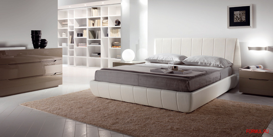 В этой композиции SUITE представлена двуспальная кровать с подкроватным ящиком. Отделка кровати выполнена из мягкой искусственной кожи. Комод и тумбы покрыты глянцевым лаком из каталога фабрики. Для удобного использования на фасаде выдвижных ящиков предусмотрено оригинальное углубление.