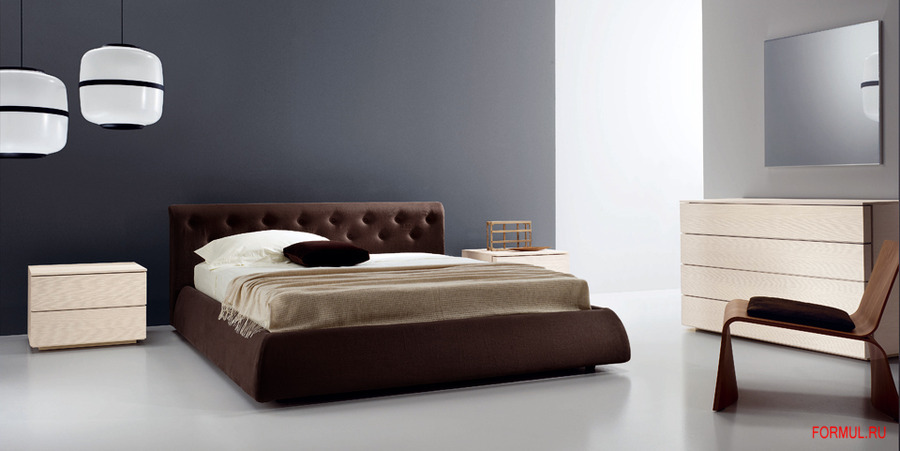 Композиция для спальной комнаты из коллекции VERA. Кровать полностью отделана тканью темно-шоколадного оттенка из ассортимента производителя. Комод и тумбы изготовлены из полированной древесины в цвете "светлый клен". Фасады выдвижных ящиков выполнены из утолщенного профиля.