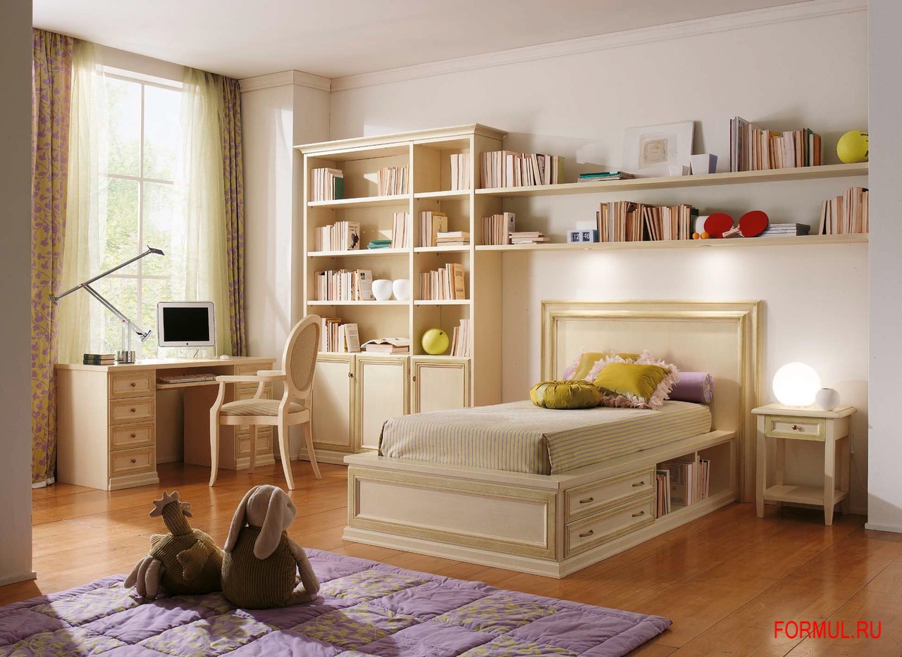 Большое место отделено учебе - имеются письменный стол, двойная тумба с ящиками и вместительный книжный шкаф, а также большие полки вдоль всей стены.