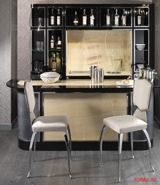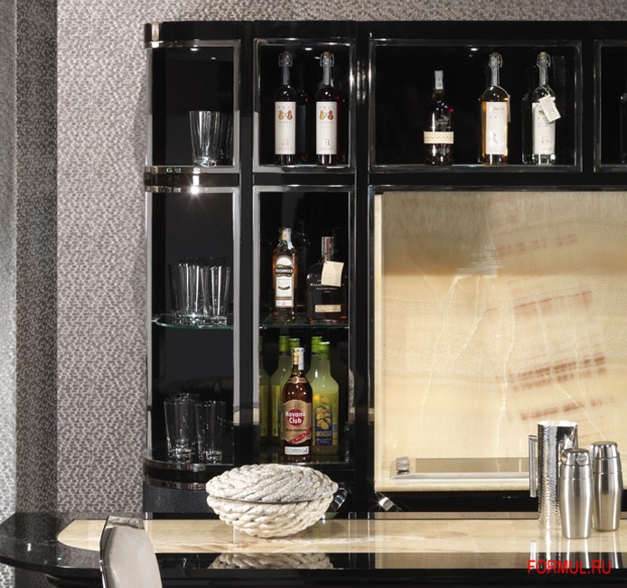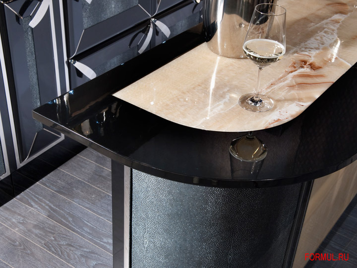 Бар в черном цвете с глянцевой поверхностью и с добавлением контрастных вставок из оникса на столешнице, между полок, кожи на основании стойки и декоративных стальных элементов. Все вместе создает притягательный дизайн, чтобы приятно провести время с друзьями и близкими.