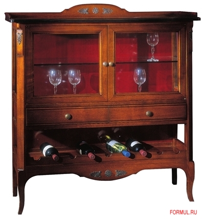 Бар в классическом стиле. Выполнен из древесины вишни. Включает два выдвижных ящика в традиционном соединении "ласточкин хвост", две распашные остекленные дверцы и полку с углублениями для бутылок. Отделка поверхностей – пчелиный воск, лак.
