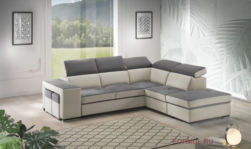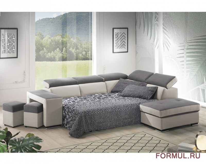 Диван Matera с современными и решительными линиями, с 5 регулируемыми подголовниками, пуфами для хранения и удобной плоской кроватью адаптируется к различным типам помещений.