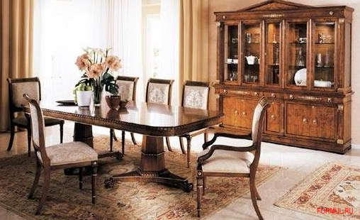 Коллекция выполнена в классическом стиле. В группу входят: прямоугольный стол, стулья, обитые текстилем из коллекции фабрики, зеркало и два шкафа.