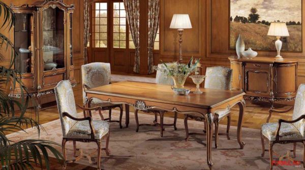Столовая группа, выполненная в классическом стиле. Комплект включает в себя прямоуголный стол и стулья в текстильной обивке, а также другие предметы мебели, цветовая гамма которых различна. Коллекция отлично подойдет для столовой, выполненной в классическом стиле.