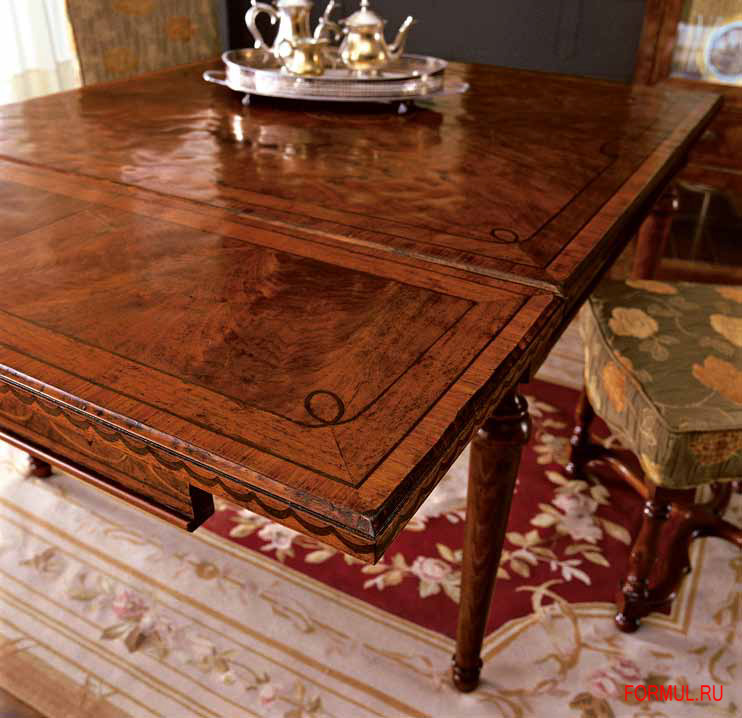 Описание: Квадратный раскладной стол, стол раскладывается с помощью 2-х вставок по 41 см. Возможны другие варианты отделки (корень мирта, розовое дерево и д.р.). Вся работа выполнена вручную.