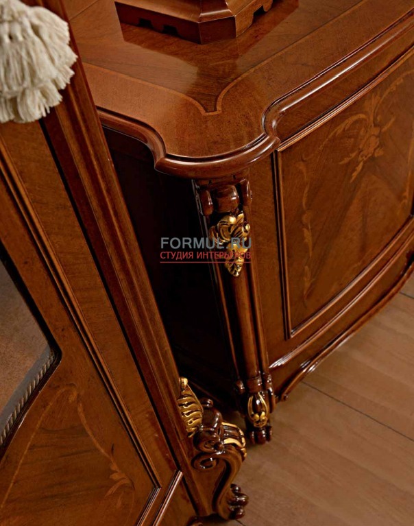 Гостиная, полная декоративного блеска, которая предусматривает тумбочку под телевизор ART. P.711 с просторной открытой нишей. Частью композиции являются и две одностворчатые витрины-близнецы ART. P.710 со стеклянными полками. Зеркало буфета заключено в деревянную раму, с украшениями по центру, повторяющими узорный мотив резных украшений витрин. Сусальное золото, едва заметное, дает легкий налет изысканности. Отделка доступна в двух вариантах: лаковый и орех версия.