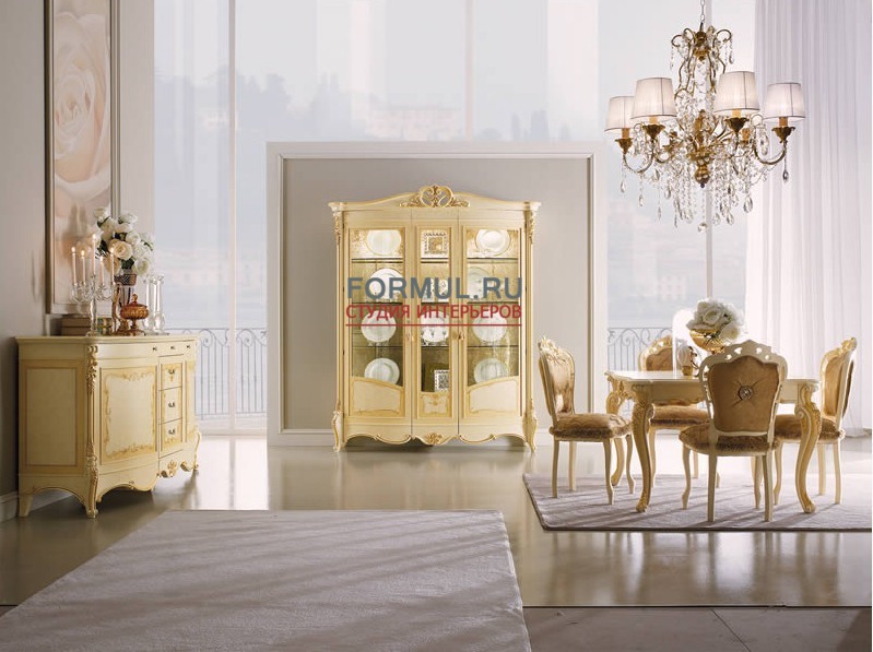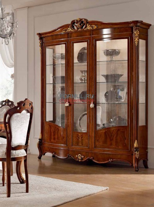 Сырье прекрасного качества – черный орех, стекло, кожа и обивочные ткани – вот залог успеха фирменной коллекции мебели для помещений дневного пребывания Баччи Стиле и свидетельство ремесленных традиций, объединившихся с новейшими технологиями. Горки, серванты и столы украшены резьбой, подчеркивающей профиль элементов. На пламенеющей ореховой поверхности видна ценная инкрустация, выполненная умелыми руками мастеров-краснодеревщиков. Техника отделки сусальным золотом дает легкий классический оттенок, что само по себе создает шарм и элегантность.