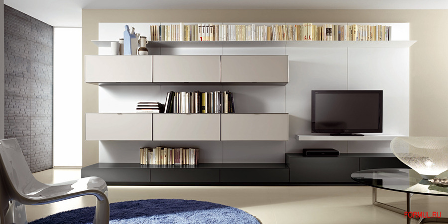 Композиция для гостиной Mercantini. Все элементы этой модели держатся на лакированном основании светло-серого оттенка. Каркас подвесных ящиков и полки покрыты белым матовым лаком. Створки шкафов изготовлены из непрозрачного стекла. Нижний ряд ящиков выполнен в черном цвете. На удобном расстоянии от пола предусмотрена отдельная полка для телевизора.