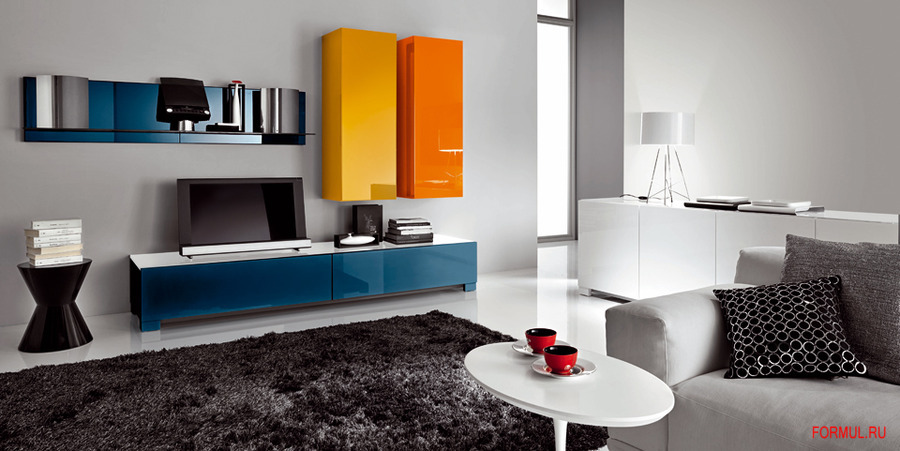 Ультраяркий комплект для гостиной от Mercantini. Нижний шкаф на низких ножках и полка для книг отделаны глянцевым лаком с эффектом зеркальной поверхности. Столешница, которая служит полкой для телевизора, покрыта белым лаком. Боковые подвесные ящики покрыты глянцевым лаком разных оттенков оранжевого.